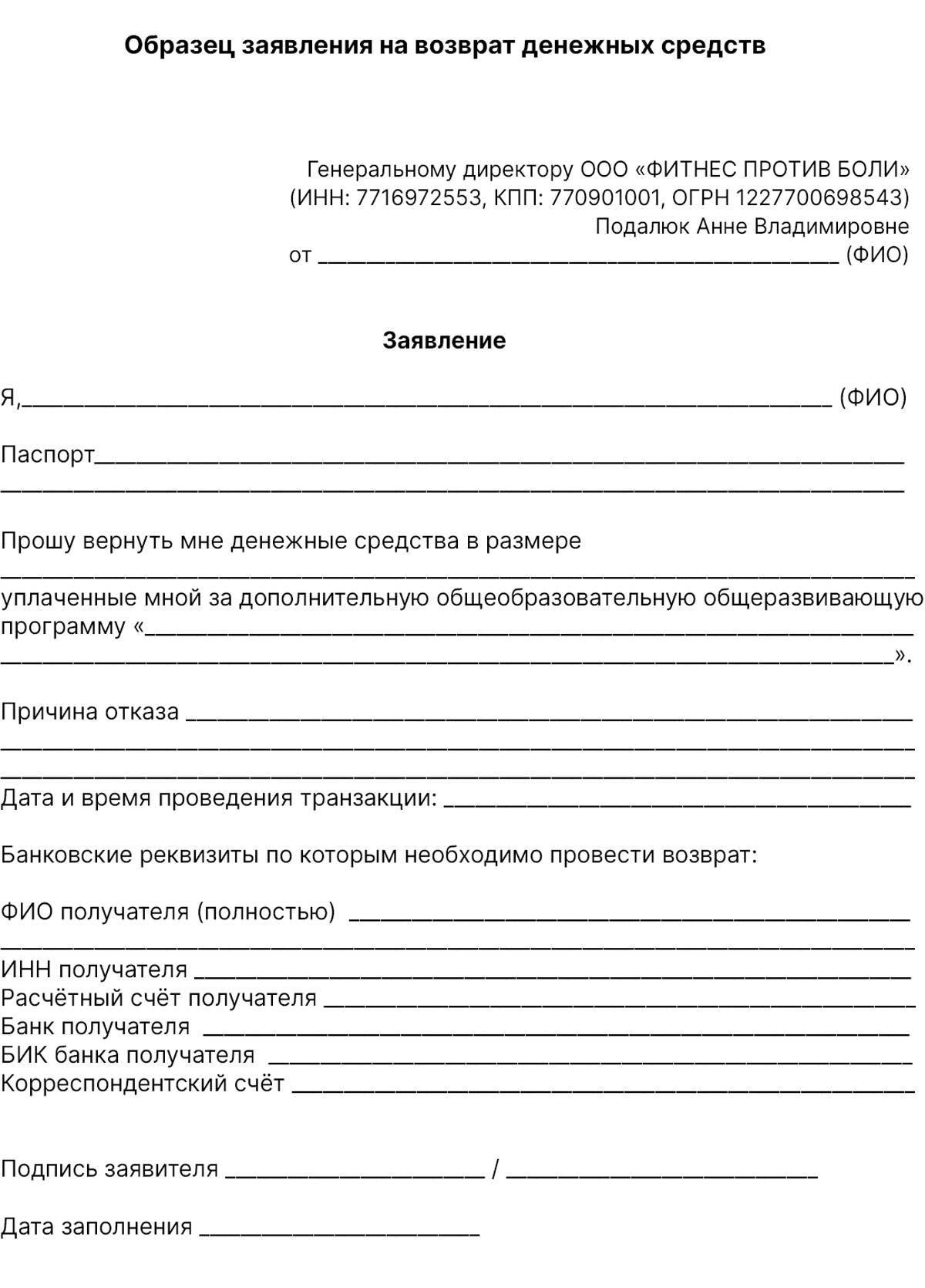 9.4. Заявление на возврат денежных средств оформляется в письменном виде на бумажном носителе, собственноручно подписывается Заказчиком и передаётся скан-копией или фотографией в хорошем, читаемом качестве в ООО «ФИТНЕС ПРОТИВ БОЛИ» вместе с реквизитами счёта, куда необходимо вернуть денежные средства, а также скан-копией или фотографией в хорошем, читаемом качестве документа, удостоверяющего личность заявителя, на электронную почту: inform@fitnopain.online или в службу заботы на web-платформе GetCourse в личном кабинете. Датой получения заявления считается дата его поступления Исполнителю.